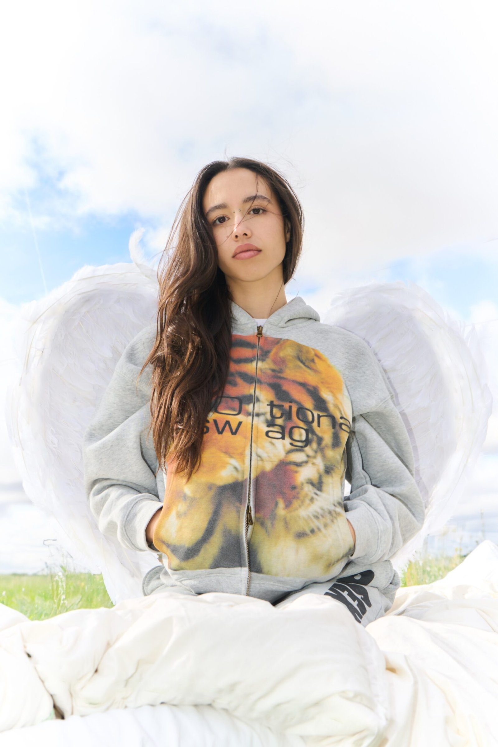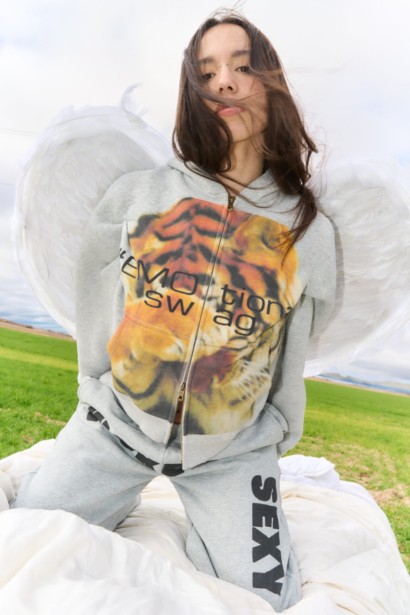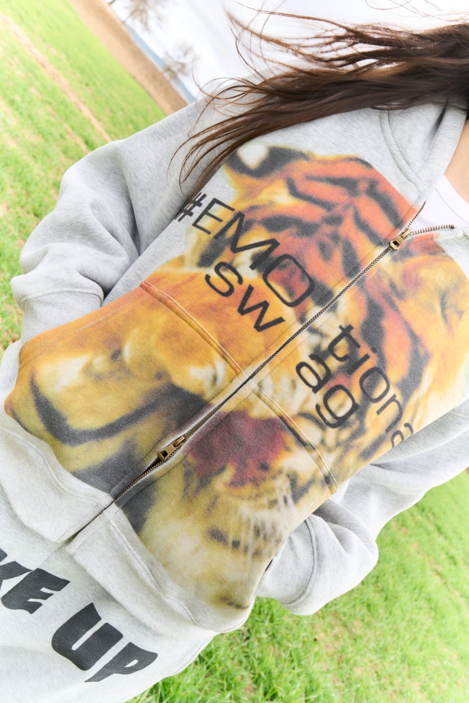 Sudadera de corte crop con doble cremallera frontal, capucha y bolsillo tipo canguro.